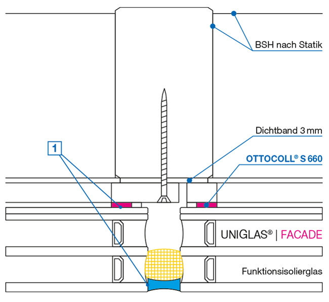 Das Prinzip ist einfach: Bei UNIGLAS® | FACADE Holz‑Glas-Verbundelementen wird die Verglasung direkt, d.h. ohne Metallprofile, auf einer Unterkonstruktion aus Holz ausgeführt. Dazu wird eine gezahnte Koppelleiste aus einem definierten Holzwerkstoff mit einem Spezial-Silikon raumseitig auf die Glasscheibe geklebt. Dieses Holz-Glas-Verbundelement wird vor Ort mit dem Holzskelett der Unterkonstruktion verschraubt. Alles, was man von außen sieht, ist eine schmale Fuge.