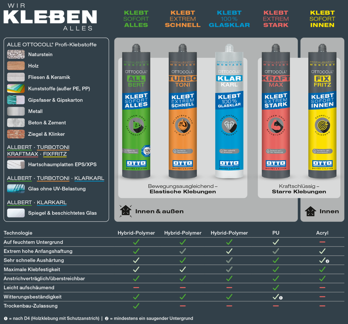 Bei Ihnen steht Ihr nächstes Projekt an: Briefkasten an die Wand kleben, Sockelleisten befestigen oder eine kaputte Vase reparieren? Kein Problem mit den OTTOCOLL® Profi-Klebstoffen.